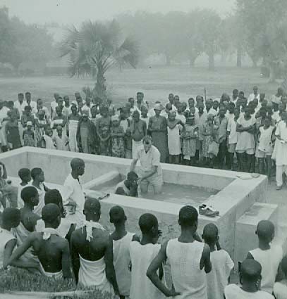 Missionary Herman Landis baptising people affected by leprosy in Nigeria. (Brethren Historical Society and Archives)